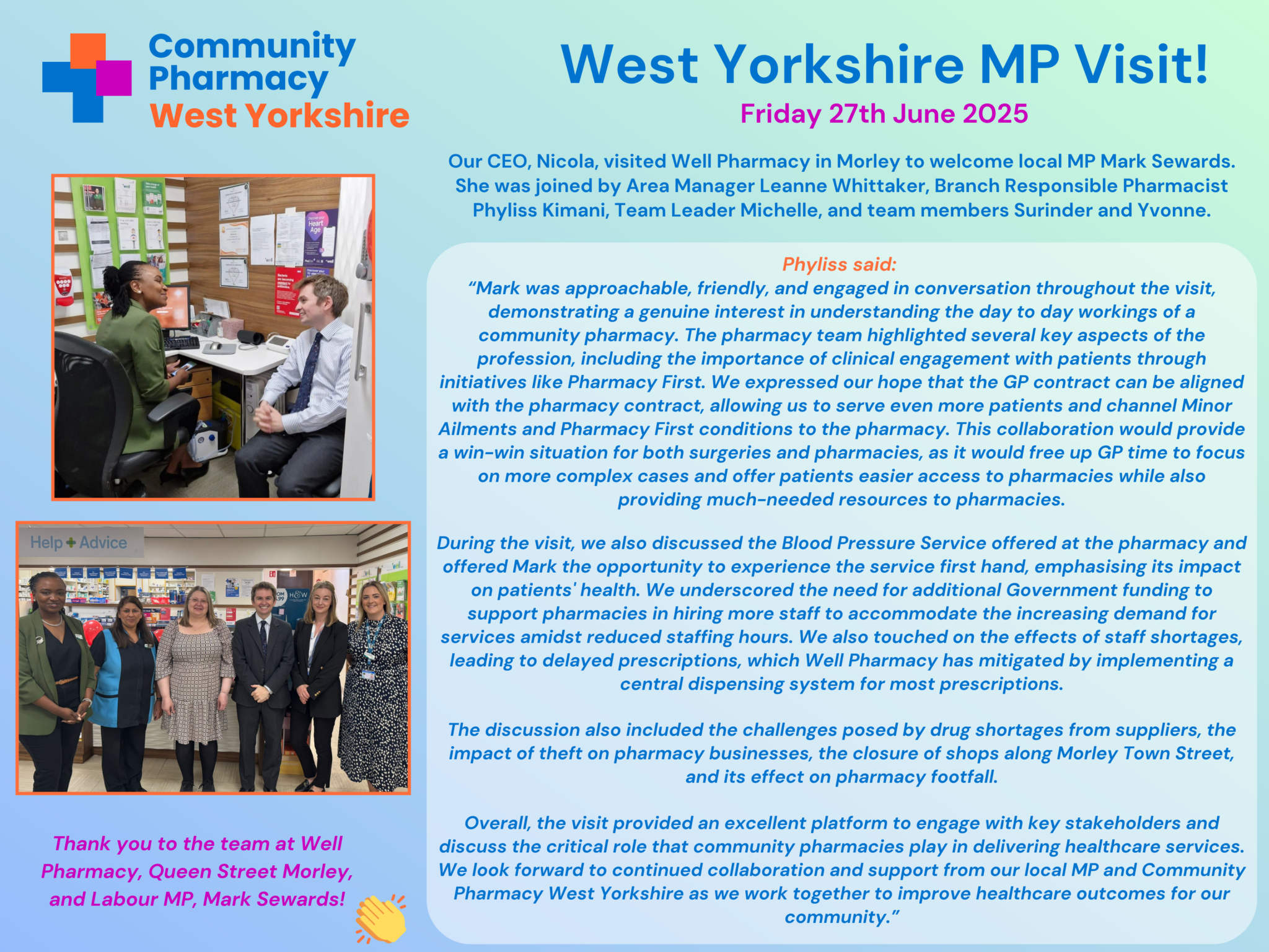 Well Pharmacy in Morley (Queen Street), recently welcomed their local MP, Mark Sewards, for a pharmacy visit.